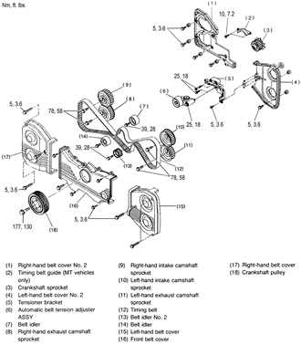 | Exploded view of the timing belt covers and components — 1.8L engine |