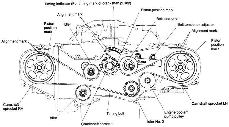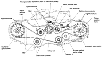 - Remove the timing belt tensioner and the timing belt tension adjuster.