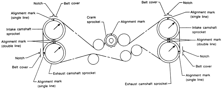 - Matchmark the timing belt to the sprocket, cover and block marks as follows: