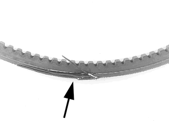 | The cover of this belt is worn, exposing the critical reinforcing cords to excessive wear |