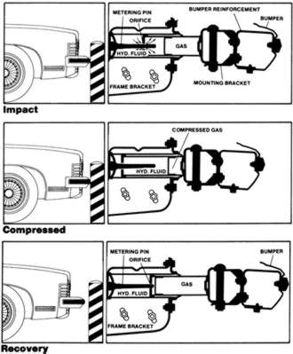 The hydraulic or gas charged bumpers worked as follows: On impact, the bumper makes contact with the barrier. As the bumper is pushed back, hydraulic fluid is pushed past the tapered metering pin, absorbing the impact. As the bumper is stopped, hydraulic fluid in the front chamber has forced the floating piston foreword, compressing the gas to return the bumper. On recovery, compressed gas forces the fluid to return to its original chamber and the bumper is returned to its original position.