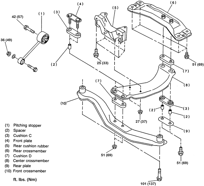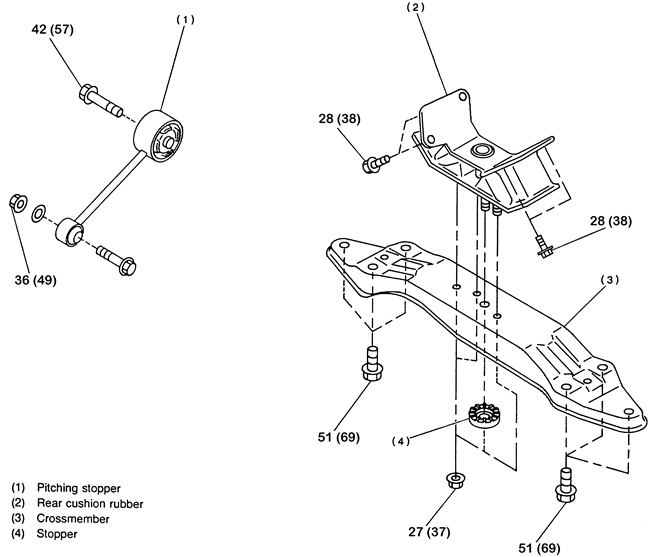 Transmission crossmember. Torque the inner nuts/bolts to 25 ft.