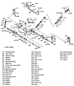 Install the rack and pinion. Torque the clamp bolts to 43 ft. lbs. (59 Nm).