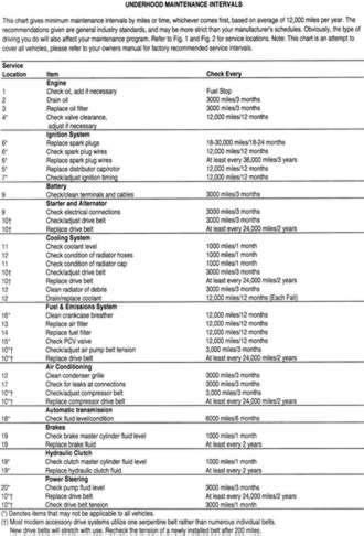 | Fig. 1: Typical underhood maintenance locations for inline-type engines (Refer to chart for descriptions) |