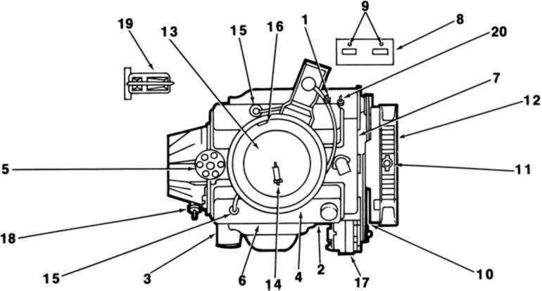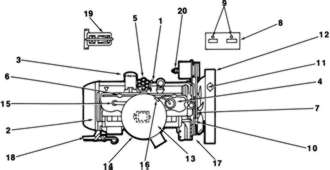 | Fig. 2: Typical underhood maintenance locations for V or opposing-type engines (Refer to chart for descriptions) |