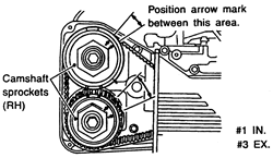 | Fig. 6: Position the camshaft as shown to adjust No. 1 intake valve and No. 3 exhaust valve |