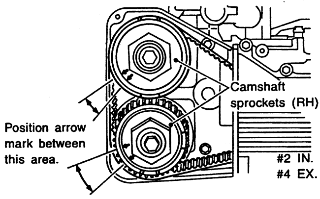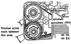 | Fig. 8: Position the camshaft as shown to adjust No. 2 intake valve and No. 4 exhaust valve |