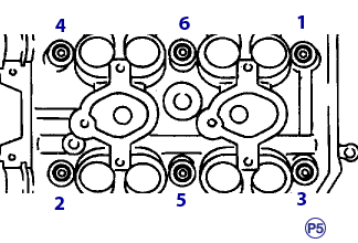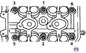 - Cylinder head bolts in the sequence shown, leaving bolts (A) and (D) partially installed to prevent the head from falling
