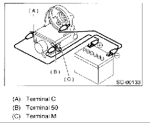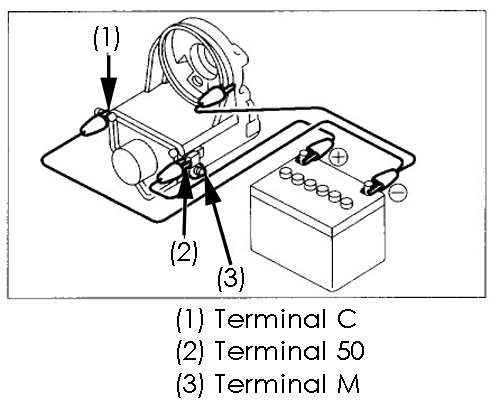 - After connecting two battery negative leads onto terminal 50 and onto switch body respectively, connect battery positive lead onto terminal C and then disconnect lead from terminal 50, pinion should return immediately