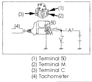 NOTE: Low rotating speed or excessive current during no-load test may be attributable to high rotating resistance of starter due to improper assembling. Small current and no torque during stall test may be attributable to excessive contact resistance between brush and commutator; whereas, normal current and insufficient torque may be attributable to shorted commutator or poor insulation. Starter can be considered normal if it passes no-load and stall tests; therefore, load test may be omitted.