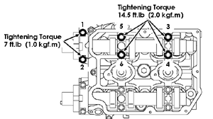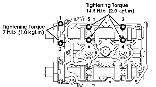 - Gradually tighten the camshaft cap and oil control valve assembly in at least two stages in alphabetical sequence shown in the figure, and then tighten to specified torque