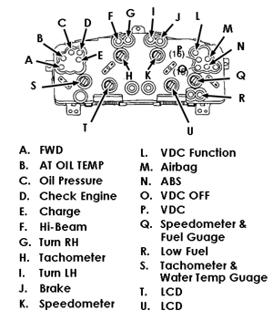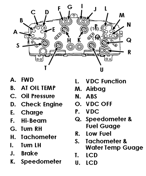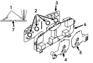 - Pull up claw (A) in portion (B) of printed circuit (C) with combination pliers. Push out speedometer assembly (D) and tachometer assembly (E) using hole (F)