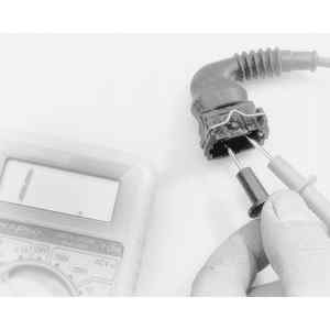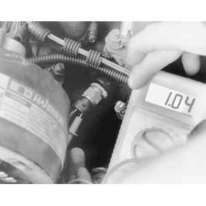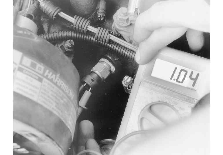 | Checking the resistance of a coolant temperature sensor with an ohmmeter. Reading is 1.04 kilohms