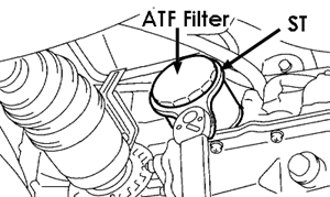 Align ST with torque wrench while tightening ATF filter. (ST 498545400 OIL FILTER WRENCH)