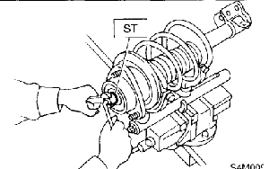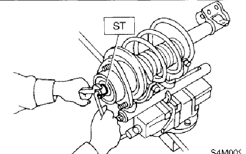NOTE: Before installing coil spring, strut mount, etc., on the strut, check for the presence of air in the dampening force generating mechanism of the strut since air prevents proper dampening force from being produced.