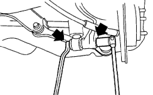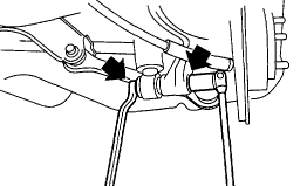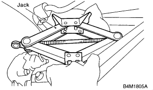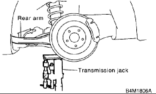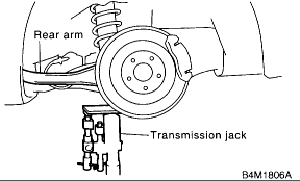 - Place jack (furnished with vehicle) upside down and position it between link rear and sub frame. Adjust jack position so rear shock absorber is aligned with rear arm at their corresponding holes