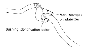 NOTE: Install bushing (on front crossmember side) while aligning it with paint mark on stabilizer. Ensure that bushing and stabilizer have the same identification colors when installing. Always tighten rubber bushing location when wheels are in full contact with the ground and vehicle is at curb weight.