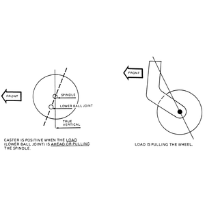 Looking at a vehicle from the side, caster angle describes the steering axis from front to rear. The steering knuckle is attached to a control arm or strut at the top and a control arm at the bottom. The wheel pivots around the line between these points to steer the vehicle. When the upper point is tilted back, this is described as positive caster. Having positive caster tends to make the wheels self-centering increasing directional stability. Excessive positive caster makes the wheels hard to steer, while an uneven caster will cause a pull to one side. Overloading the vehicle or sagging rear springs will affect caster, as it will raise the rear of the vehicle. If the rear of the vehicle is lower than normal, the caster becomes more positive.