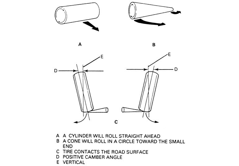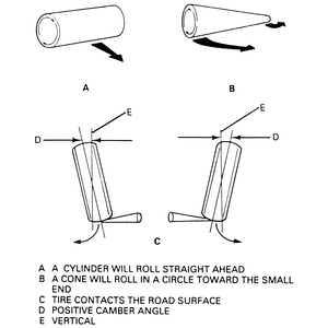 Looking from the front of the vehicle, camber is the inward or outward tilt of the top of wheels. When the tops of the wheels are tilted in, this is negative camber; if they are tilted out, positive. In a turn a slight amount of negative camber helps maximize contact of the tire with the road. Too much negative camber compromises straight-line stability, increases bump steer and torque steer.