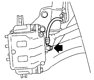 Always replace the pads for both the left and right wheels at the same time. Also replace pad clips if they are twisted or worn. A wear indicator is provided on the inner disc brake pad. If the pad wears down to such an extent that the end of the wear indicator contacts the disc rotor, a squeaking sound is produced as the wheel rotates. If this sound is heard, replace the pad. When replacing the pads, replace pads of the right and left wheels at the same time.